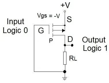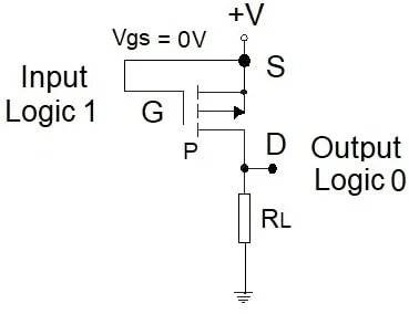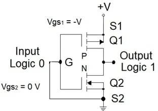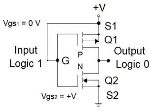 +V输入(Vgs=0V)不充电栅电容,晶体管保持截止,其高阻使输出接地(逻辑0)。接地输入(Vgs=-V)使栅电容充电,电容另一侧的正电荷将n型硅表面转为p型材料,形成源漏间低阻p沟道,晶体管开启,Id从源极流向漏极。此时导通电阻远小于负载电阻,输出近+V(逻辑1)。与NMOS相同,输入逻辑0输出逻辑1,反之亦然。