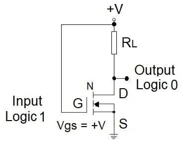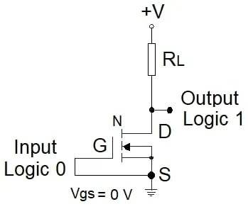常规用法以栅极为输入、漏极为输出,源极与衬底接地。图1显示增强型n沟道MOS(NMOS)在输入接地时的符号与连接。正电压+V通过负载电阻(RL)为漏极供电形成偏置。负载电阻产生Id∙RL压降(Id为漏极电流),衬底、源极和栅极均接地。