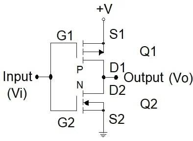 CMOS反相器结构简洁(图6),将功耗降至最低。它由增强型NMOS和PMOS串联构成,各晶体管互为对方的负载电阻。栅极并联为输入端,漏极连接处为输出端。PMOS(Q1)衬底和源极接+V,NMOS(Q2)对应端接地。