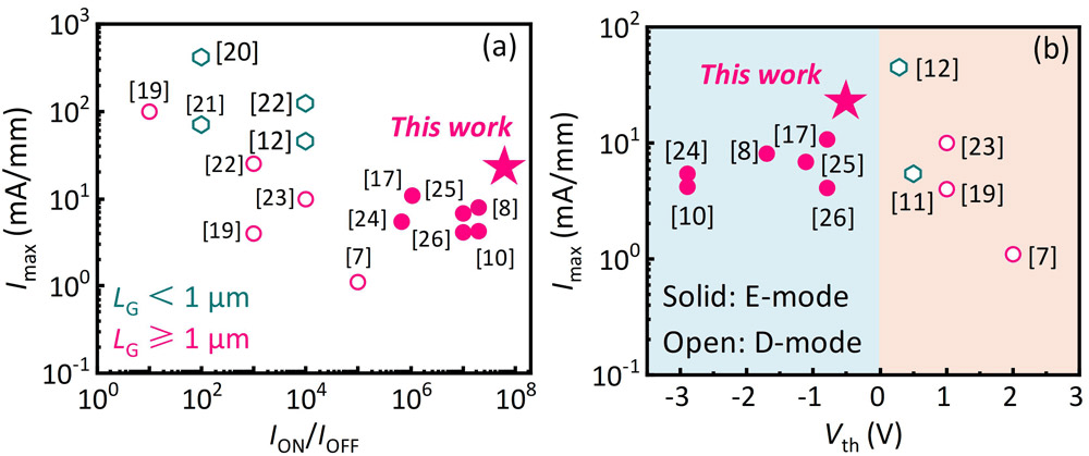 根据与已发表研究相对比的基准图(图2),研究团队称“在增强型GaN p-FET中,新器件的Imax和ION/IOFF更为出色”。由于研究目标是功率集成电路的部署,该基准排除了FinFET和三栅结构,因为这两类器件的目标是高速/射频性能。