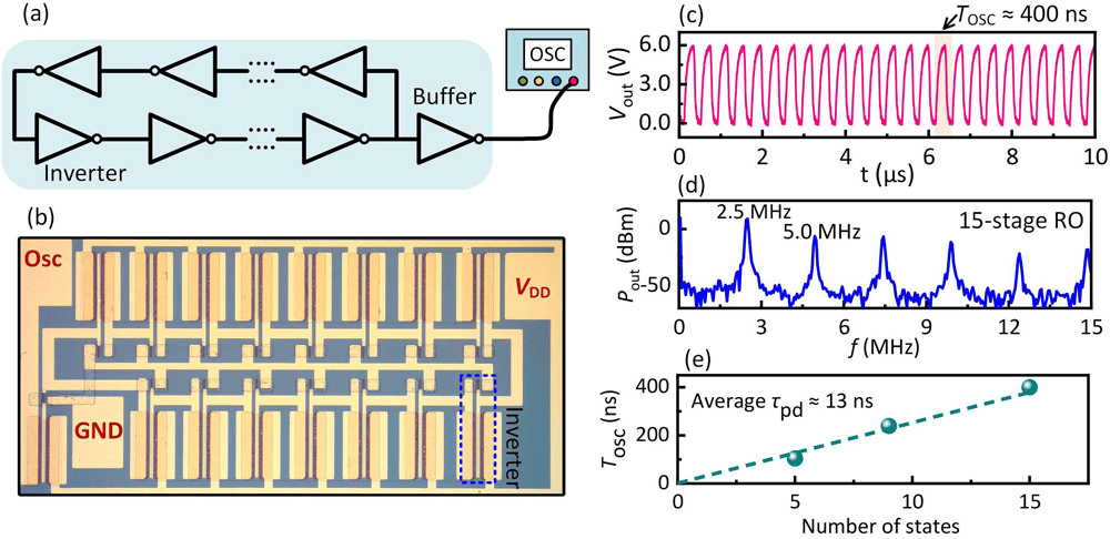 图4:(a)环形振荡器电路。(b)15级环形振荡器的显微照片。(c)-(d)15级环形振荡器在VDD = 6V时的电压波形和功率谱,具有约400ns的振荡周期(Tosc)和2.5MHz的基频(fosc)。(e)Tosc与环形振荡器级数(N)的相对关系。